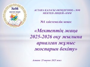 2025 жылғы 25 тамызда Астана қаласы әкімдігінің «№ 98 мектеп-лицейі» КММ директордың пролфильдік оқыту жөніндегі орынбасары «Мектептің 2025-2026 оқу жылына арналған жұмыс жоспарын бекіту»тақырыбында әдістемелік кеңес өткізді