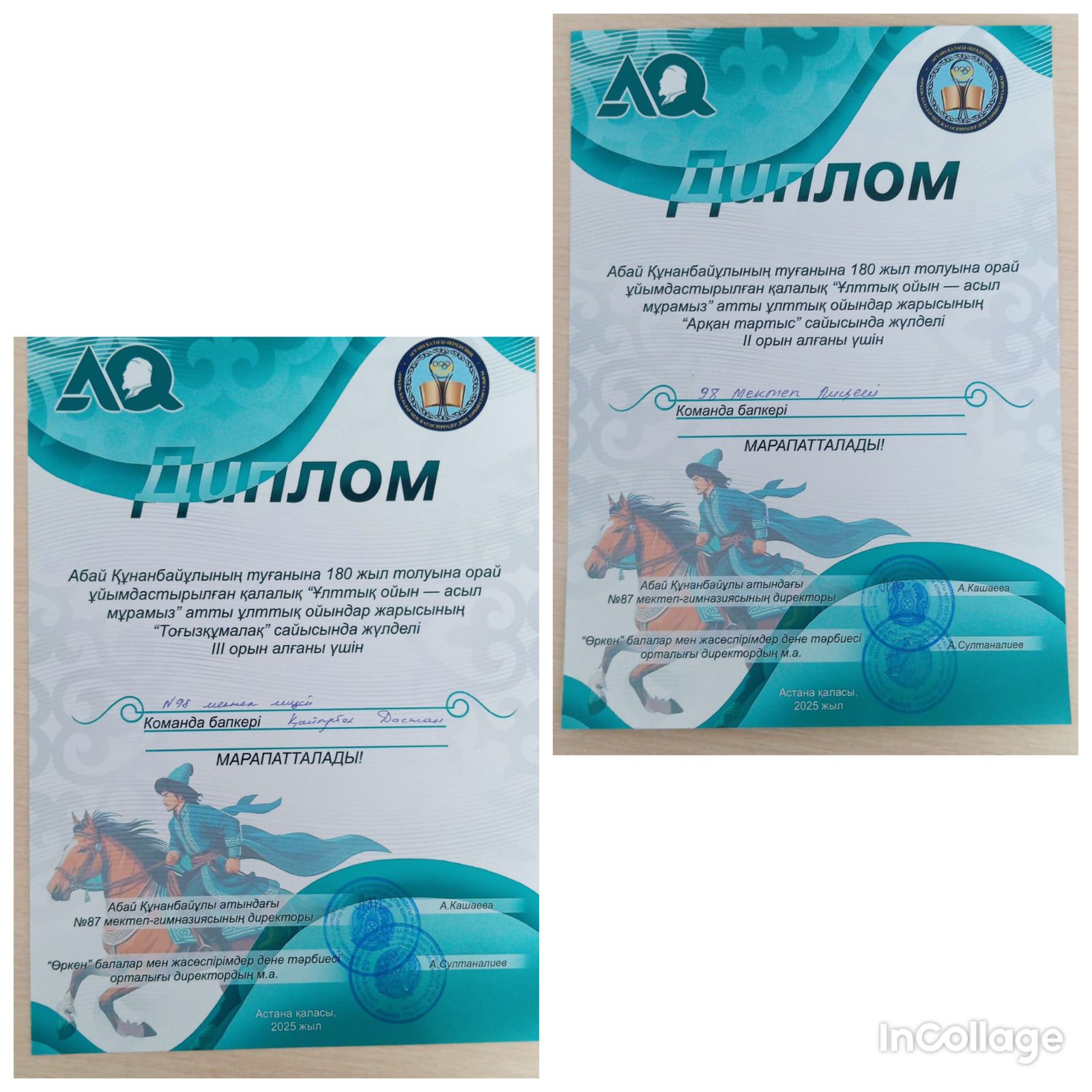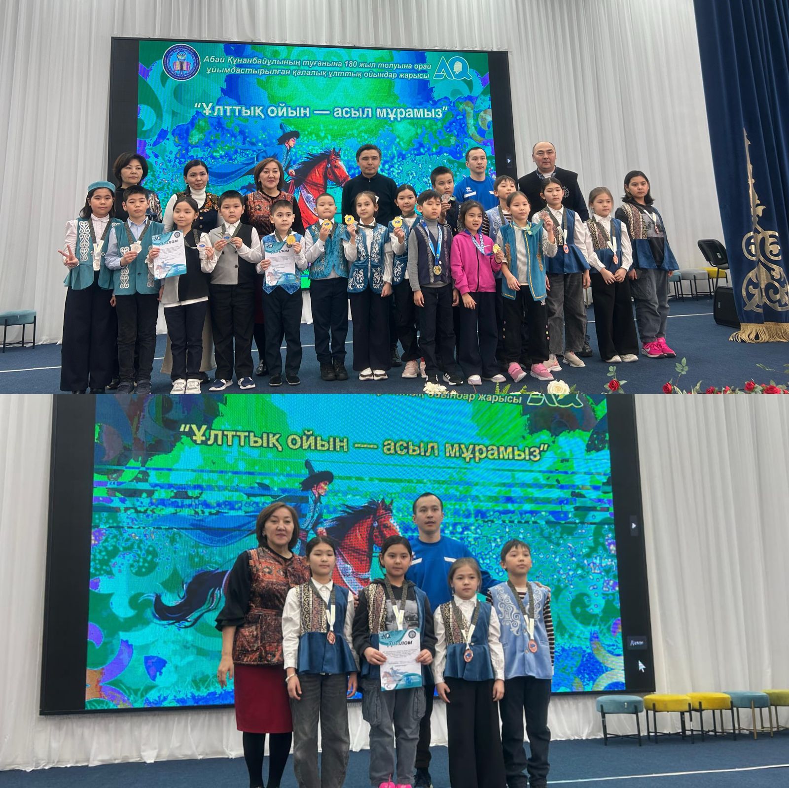 Абай Құнанбайұлының туғанына 180 жыл толуына орай ұйымдастырылған қалалық “Ұлттық ойын — асыл мұрамыз” атты ұлттық ойындар жарысынан мектебіміздің оқушылары жүлделі орындармен оралды. Оқушыларымызбен мұғалімдерімізді жеңістерімен құттықтаймыз??Керемет???
