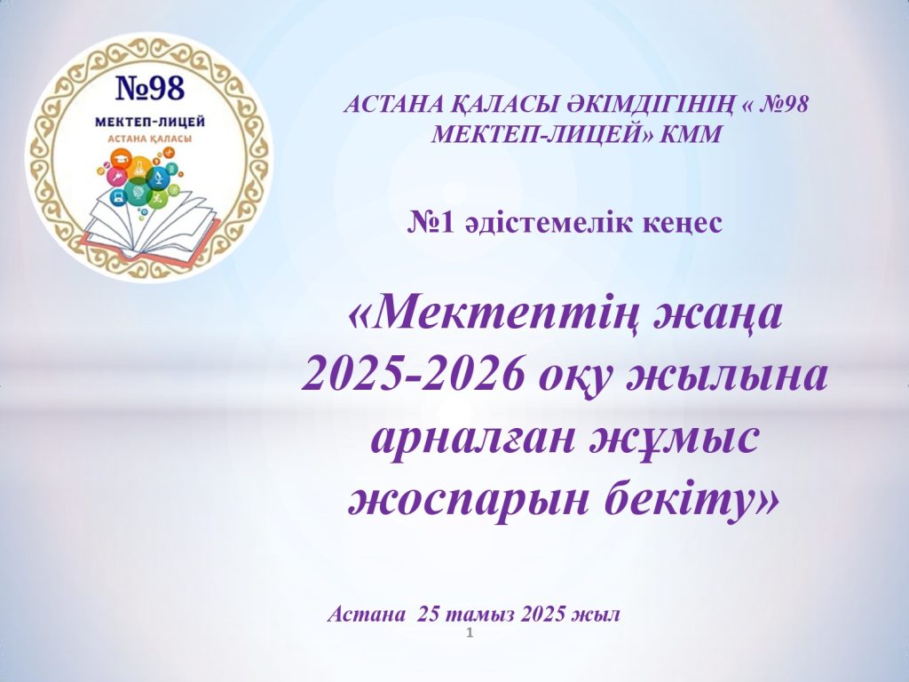 2025 жылғы 26 тамызда Астана қаласы әкімдігінің » № 98 мектеп-лицейі » КММ-де «Білім беру ұйымының 2025–2026 оқу жылындағы білім беру саясаты мен басымдықтары» педагогикалық кеңесі өтті. Педагогикалық кеңестің мақсаты: мемлекеттік білім беру саясатын іске асыруда бірыңғай тәсілді қамтамасыз ету, 2025–2026 оқу жылына педагогикалық ұжым қызметінің негізгі міндеттерін айқындау.. Мектеп директоры Г. А. Оспанова құттықтау…